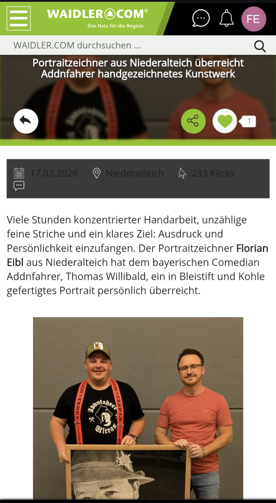" Servus, mein Name ist Florian Eibl, ich bin Künstler aus Niederalteich in Niederbayern und zeichne detailreiche Bleistiftportraits von Menschen, Tieren und bekannten Persönlichkeiten."